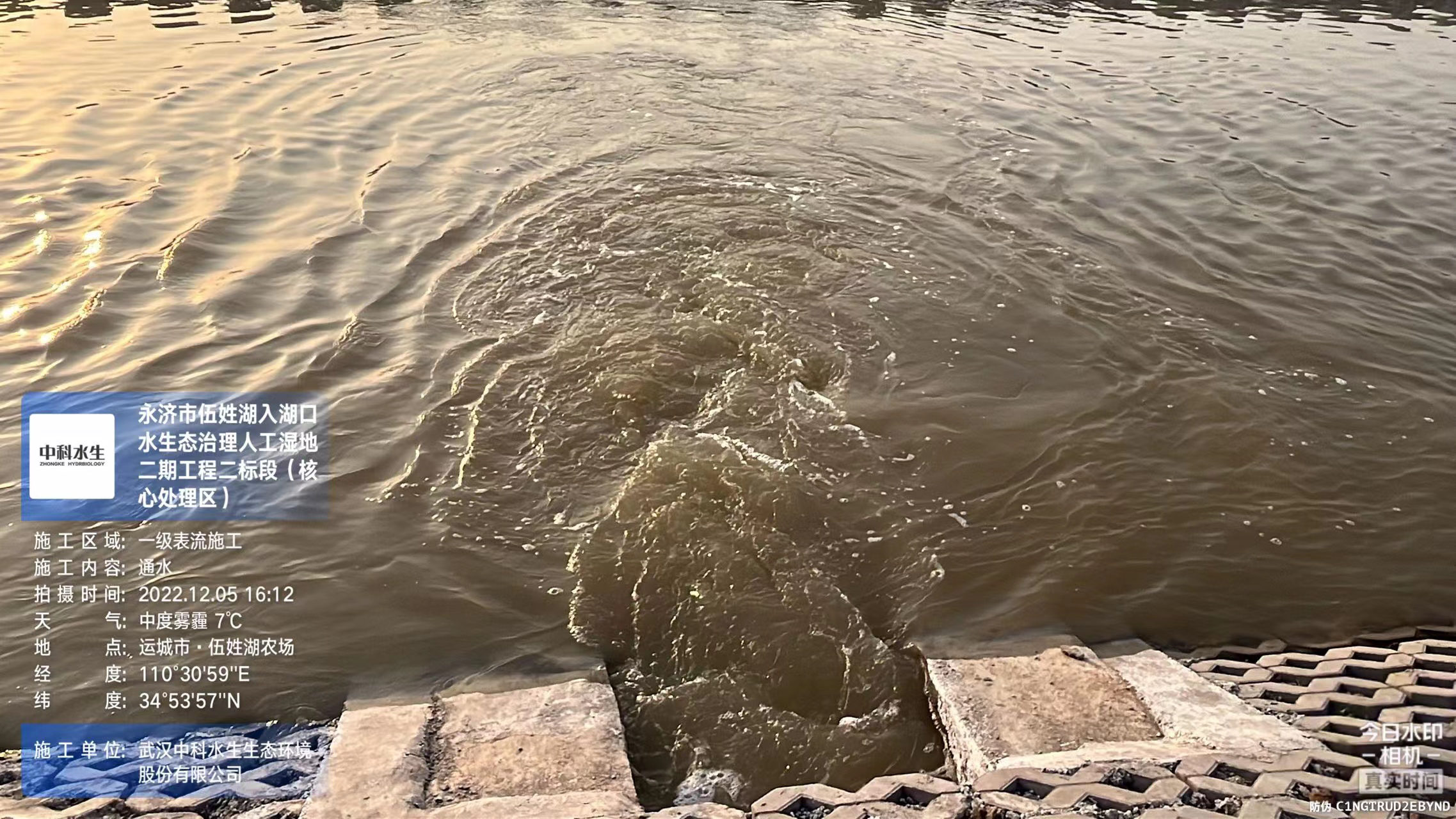 永济市伍姓湖入湖口水生态治理人工湿地二期工程(核心湿地区)一级表面流湿地、一区潜流湿地、二区潜流湿地达成通水条件,池体内水位稳步上升,正式通水调试运行,初步试运行状态良好,目前已有越冬候鸟迁徙栖息。