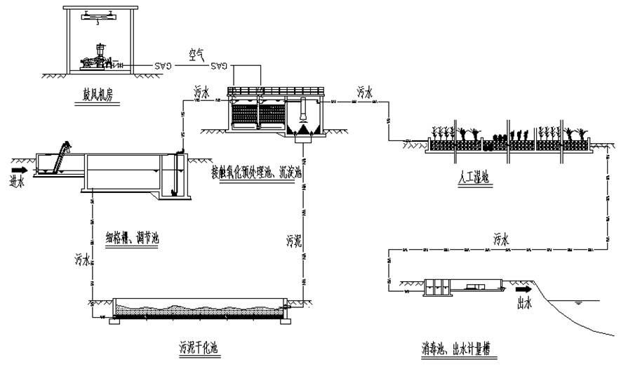 乡镇污水处理工程有其独特的特点,不同于城市污水处理工程,主要在于乡镇污水处理工程其规模小、水量及水质变化大、维护管理专业人员较缺乏、运营经费及投资费用较少。目前我国乡镇污水处理工程在部分省市区域已实施,大部分乡镇污水处理工程采用常规污水处理工艺,有些常规污水处理工艺并不适合乡镇污水处理工程,主要问题在于常规污水处理工艺运用于乡镇污水处理工程时建设投资大、运行成本高、管理复杂等。针对常规污水处理工艺不能满足乡镇污水处理工程要求,我公司通过多年研发和实践,拥有以“生物接触氧化+沉淀+人工湿地”为主体工艺路线的污水处理技术,经过采用该污水处理技术的十多个乡镇污水处理工程多年来运行结果表明,“生物接触氧化+沉淀+人工湿地”工艺路线是适合我国部分乡镇污水处理工程。